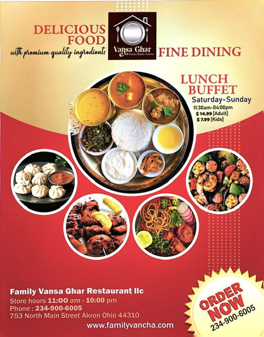 Family Vansa Ghar Restaurant & Bar is a locally owned and operated Indian restaurant located in the heart of Akron, OH, offering a wide variety of delicious dishes to suit every taste. Our menu features classic Indian food and Nepali food, all made with the freshest ingredients and prepared with care by our talented team of chefs. At Family Vansa Ghar Restaurant & Bar, we believe that dining out should be an experience, which is why we have created a warm and inviting atmosphere for you to enjoy. Our friendly staff is here to make sure you have a memorable meal, whether you're joining us for a quick bite or having a meal with your family or friends.